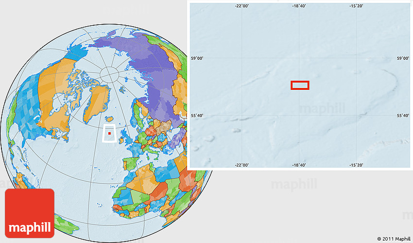 Maphill is a collection of map images. This image combines a political map with the globe centered on the area around 57° 25' 7" N, 18° 37' 30" W. Use the buttons under the image to switch to different map types.