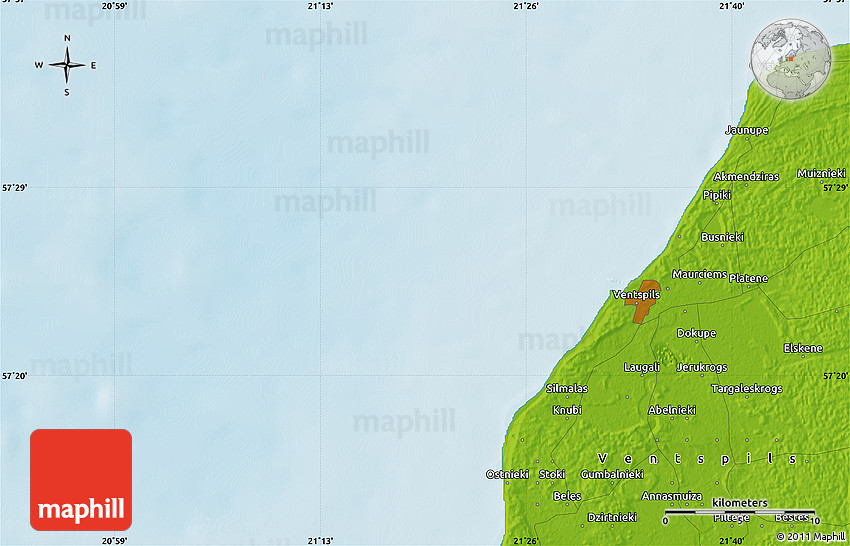 Maphill is a collection of map images. This physical map of the area around 57° 25' 7" N, 21° 19' 30" E is one of them. Click on the Detailed button under the image to switch to a more detailed map.