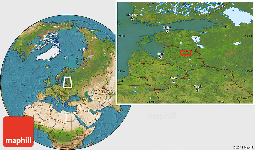 Maphill is a collection of map images. This image combines a satellite map with the globe centered on the area around 57° 25' 7" N, 26° 25' 29" E. Use the buttons under the image to switch to different map types.