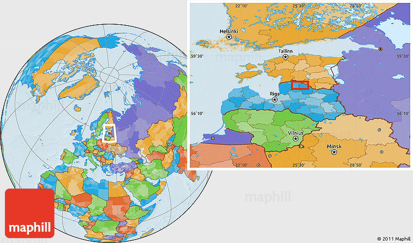Maphill is a collection of map images. This image combines a political map with the globe centered on the area around 57° 46' 59" N, 25° 34' 30" E. Use the buttons under the image to switch to different map types.