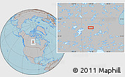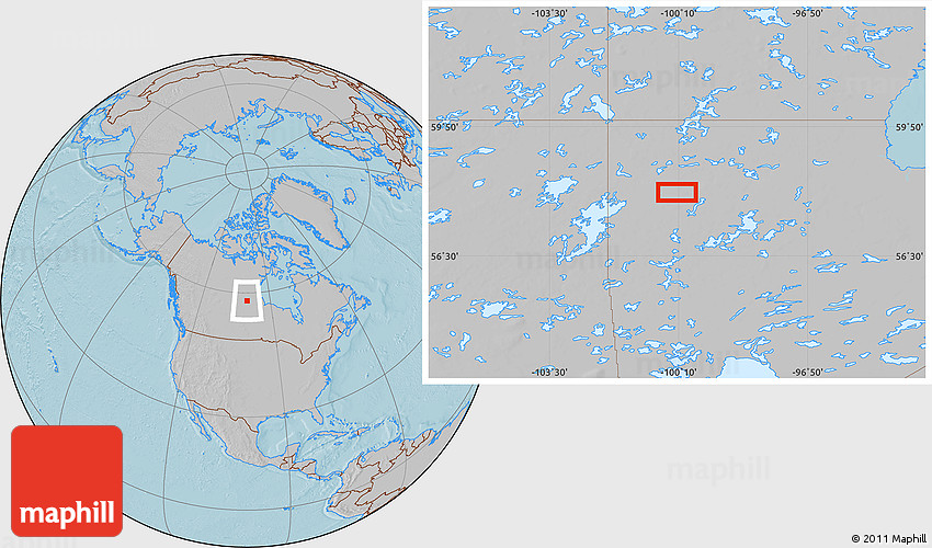 Maphill is a collection of map images. This image combines a gray map with the globe centered on the area around 58° 8' 44" N, 100° 13' 29" W. Use the buttons under the image to switch to different map types.