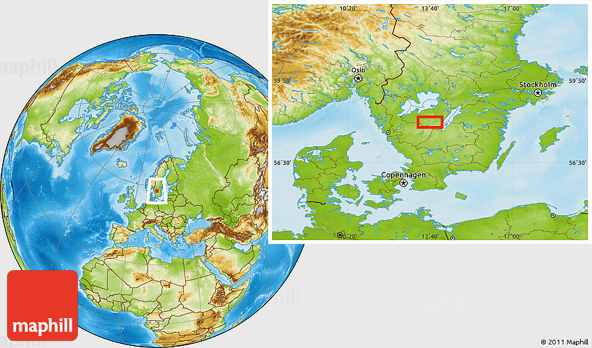 Maphill is a collection of map images. This image combines a physical map with the globe centered on the area around 58° 8' 44" N, 13° 40' 30" E. Use the buttons under the image to switch to different map types.