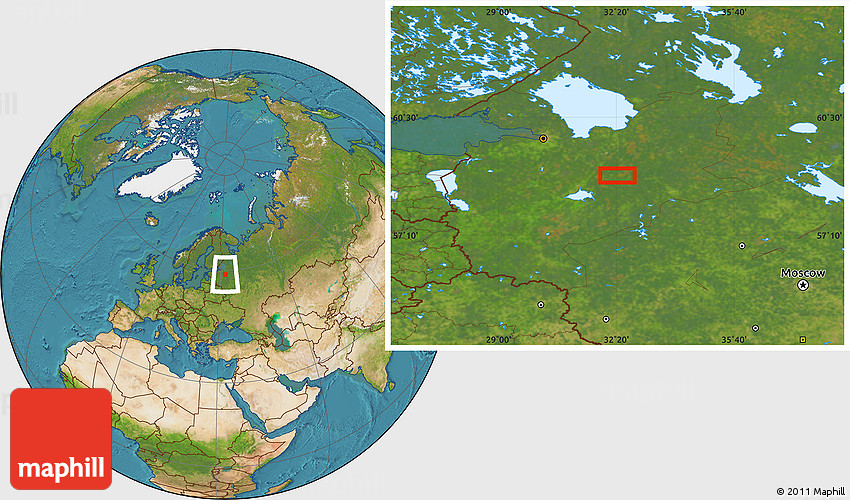 Maphill is a collection of map images. This image combines a satellite map with the globe centered on the area around 58° 51' 53" N, 32° 22' 30" E. Use the buttons under the image to switch to different map types.