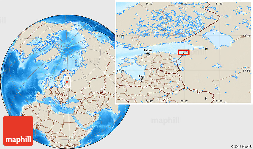 Maphill is a collection of map images. This image combines a shaded relief map with the globe centered on the area around 59° 34' 34" N, 28° 7' 30" E. Use the buttons under the image to switch to different map types.