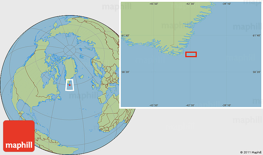 The location map of the area around 59° 55' 44" N, 42° 25' 29" W combines two projections: the orthographic azimuthal projection for the globe and the simple geographic projection for the rectangular part of the map. Geographic projection has straight meridians and parallels, each degree of latitude and longitude is the same size over the entire world map.