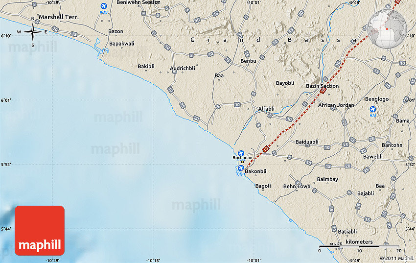 Maphill is a collection of map images. This shaded relief map of the area around 5° 56' 49" N, 10° 7' 30" W is one of them. Click on the Detailed button under the image to switch to a more detailed map.
