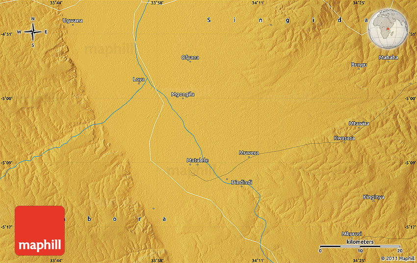 Maphill is a collection of map images. This physical map of the area around 5° 4' 25" S, 34° 4' 30" E is one of them. Click on the Detailed button under the image to switch to a more detailed map.