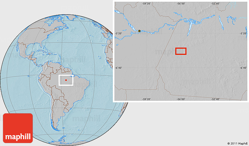 Maphill is a collection of map images. This image combines a gray map with the globe centered on the area around 5° 4' 25" S, 56° 1' 29" W. Use the buttons under the image to switch to different map types.