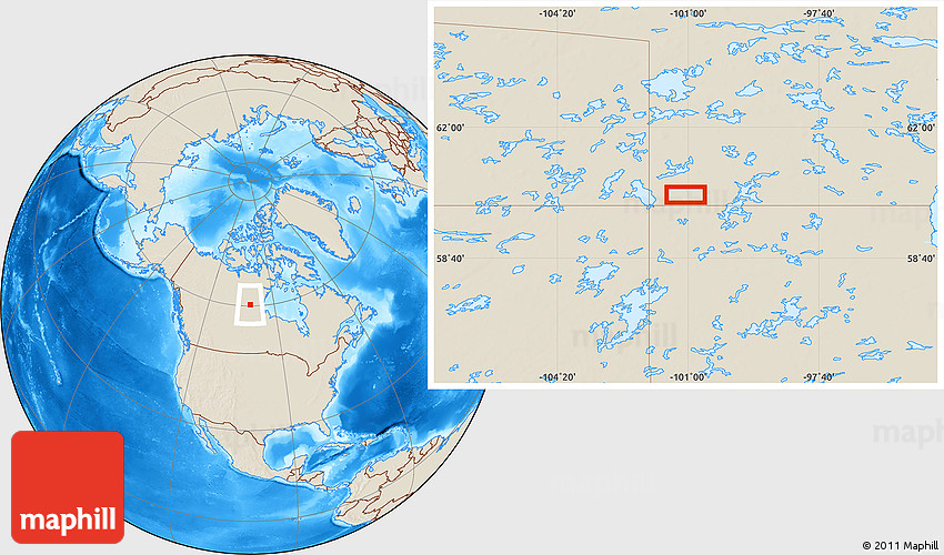 Maphill is a collection of map images. This image combines a shaded relief map with the globe centered on the area around 60° 16' 48" N, 101° 4' 29" W. Use the buttons under the image to switch to different map types.