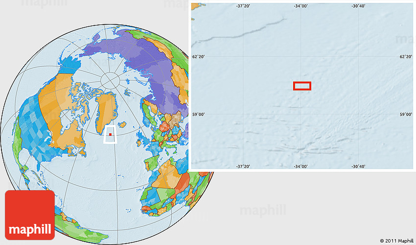 Maphill is a collection of map images. This image combines a political map with the globe centered on the area around 60° 37' 44" N, 33° 55' 29" W. Use the buttons under the image to switch to different map types.