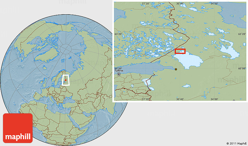 The location map of the area around 61° 39' 52" N, 30° 40' 29" E combines two projections: the orthographic azimuthal projection for the globe and the simple geographic projection for the rectangular part of the map. Geographic projection has straight meridians and parallels, each degree of latitude and longitude is the same size over the entire world map.