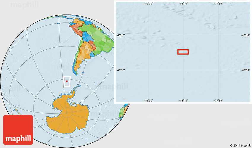 Maphill is a collection of map images. This image combines a political map with the globe centered on the area around 61° 46' 42" S, 83° 13' 29" W. Use the buttons under the image to switch to different map types.