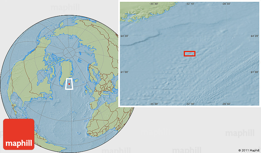 The location map of the area around 62° 40' 59" N, 32° 13' 30" W combines two projections: the orthographic azimuthal projection for the globe and the simple geographic projection for the rectangular part of the map. Geographic projection has straight meridians and parallels, each degree of latitude and longitude is the same size over the entire world map.