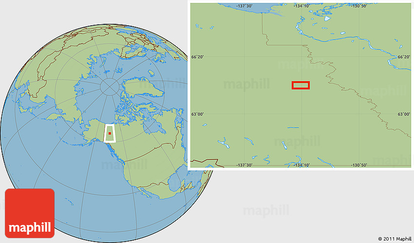 The location map of the area around 64° 40' 8" N, 134° 13' 29" W combines two projections: the orthographic azimuthal projection for the globe and the simple geographic projection for the rectangular part of the map. Geographic projection has straight meridians and parallels, each degree of latitude and longitude is the same size over the entire world map.
