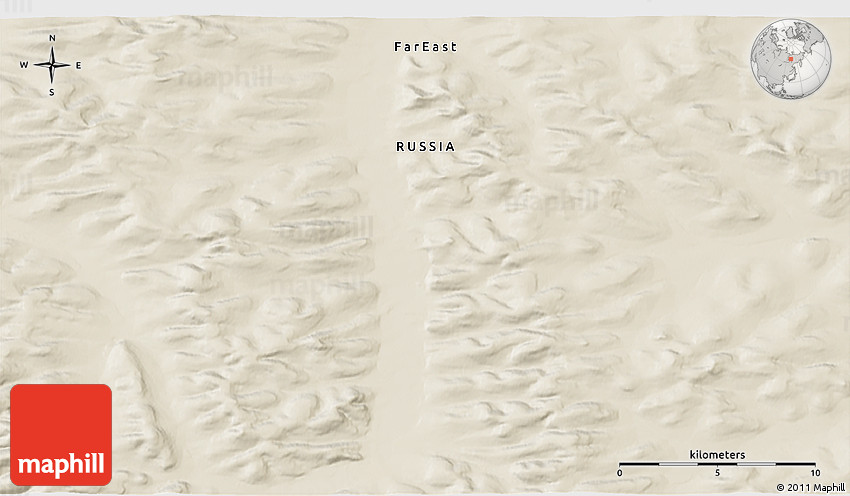Shaded relief map shows landscape features, such as mountains, valleys and plateaus. Flat areas are smooth on the map, areas with steep slopes and mountains appear more rough. The above map of the area around 65° 38' 11" N, 133° 31' 30" E was created using a digital elevation model.