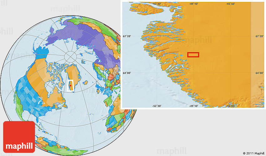 Maphill is a collection of map images. This image combines a political map with the globe centered on the area around 65° 38' 11" N, 49° 13' 30" W. Use the buttons under the image to switch to different map types.