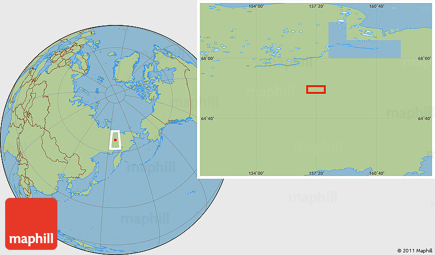 The location map of the area around 66° 16' 20" N, 157° 19' 29" E combines two projections: the orthographic azimuthal projection for the globe and the simple geographic projection for the rectangular part of the map. Geographic projection has straight meridians and parallels, each degree of latitude and longitude is the same size over the entire world map.