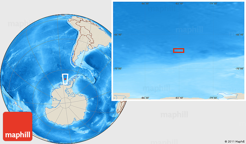 Maphill is a collection of map images. This image combines a shaded relief map with the globe centered on the area around 68° 14' 11" S, 83° 13' 29" W. Use the buttons under the image to switch to different map types.