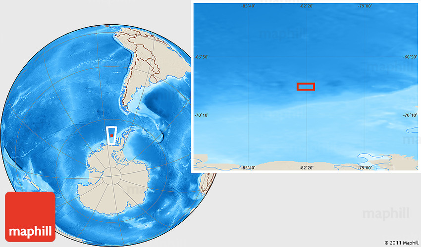 Maphill is a collection of map images. This image combines a shaded relief map with the globe centered on the area around 68° 32' 24" S, 82° 22' 30" W. Use the buttons under the image to switch to different map types.