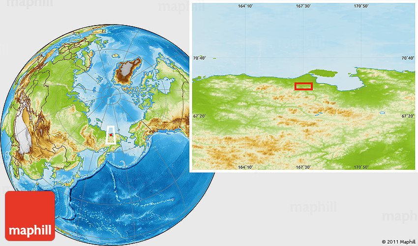 Maphill is a collection of map images. This image combines a physical map with the globe centered on the area around 69° 2' 31" N, 167° 31' 30" E. Use the buttons under the image to switch to different map types.