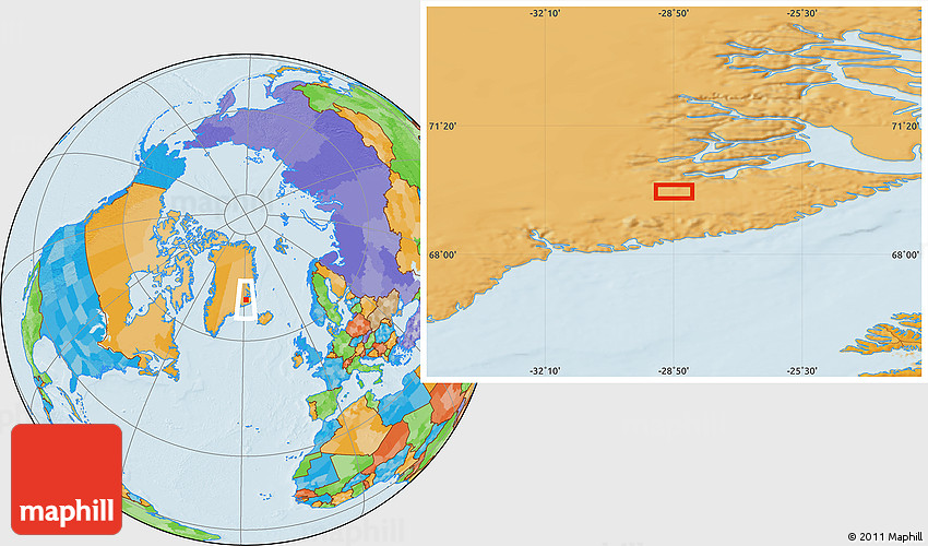 Maphill is a collection of map images. This image combines a political map with the globe centered on the area around 69° 38' 15" N, 28° 49' 30" W. Use the buttons under the image to switch to different map types.
