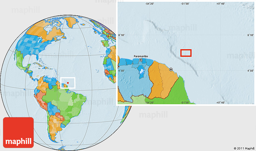 Maphill is a collection of map images. This image combines a political map with the globe centered on the area around 6° 28' 13" N, 50° 55' 29" W. Use the buttons under the image to switch to different map types.