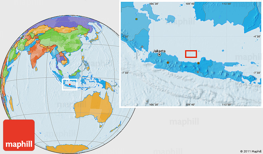 Maphill is a collection of map images. This image combines a political map with the globe centered on the area around 6° 7' 16" S, 109° 43' 29" E. Use the buttons under the image to switch to different map types.
