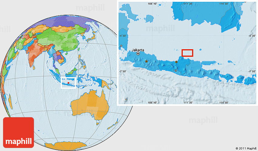 Maphill is a collection of map images. This image combines a political map with the globe centered on the area around 6° 7' 16" S, 111° 25' 30" E. Use the buttons under the image to switch to different map types.