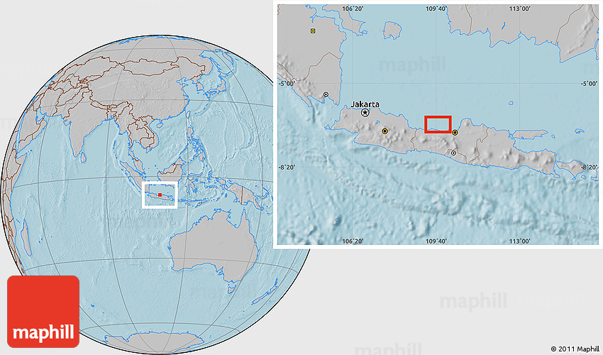 Maphill is a collection of map images. This image combines a gray map with the globe centered on the area around 6° 38' 39" S, 109° 43' 29" E. Use the buttons under the image to switch to different map types.