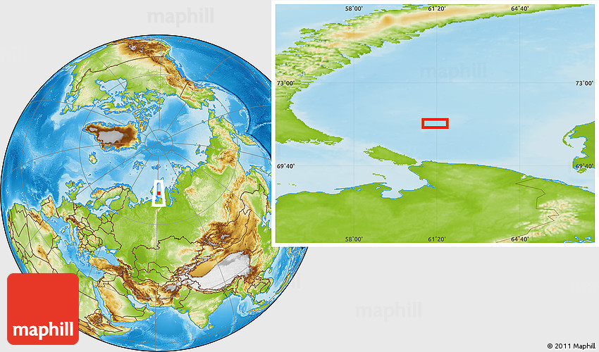 Maphill is a collection of map images. This image combines a physical map with the globe centered on the area around 71° 22' 52" N, 61° 16' 29" E. Use the buttons under the image to switch to different map types.