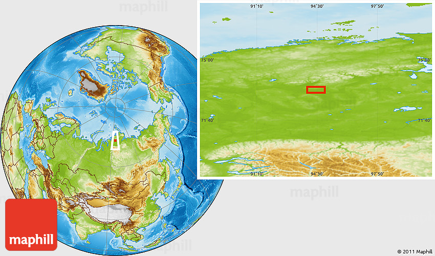 Maphill is a collection of map images. This image combines a physical map with the globe centered on the area around 73° 20' 8" N, 94° 25' 30" E. Use the buttons under the image to switch to different map types.