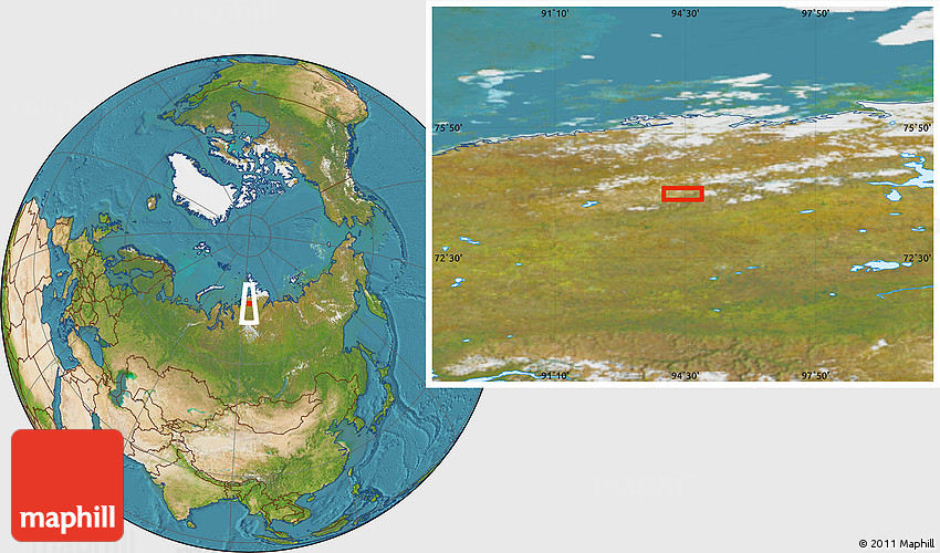Maphill is a collection of map images. This image combines a satellite map with the globe centered on the area around 74° 8' 51" N, 94° 25' 30" E. Use the buttons under the image to switch to different map types.