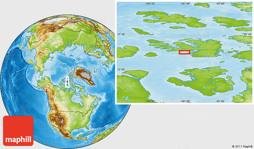 Maphill is a collection of map images. This image combines a physical map with the globe centered on the area around 75° 28' 0" N, 101° 4' 29" W. Use the buttons under the image to switch to different map types.