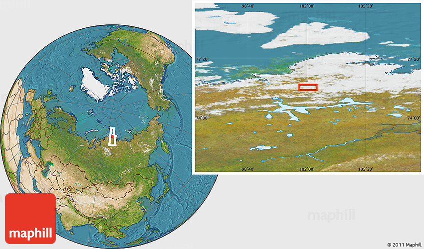 Maphill is a collection of map images. This image combines a satellite map with the globe centered on the area around 75° 43' 32" N, 102° 4' 29" E. Use the buttons under the image to switch to different map types.