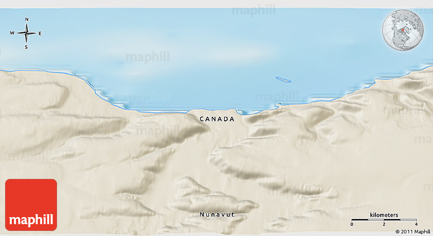 Shaded relief map shows landscape features, such as mountains, valleys and plateaus. Flat areas are smooth on the map, areas with steep slopes and mountains appear more rough. The above map of the area around 75° 43' 32" N, 83° 13' 29" W was created using a digital elevation model.