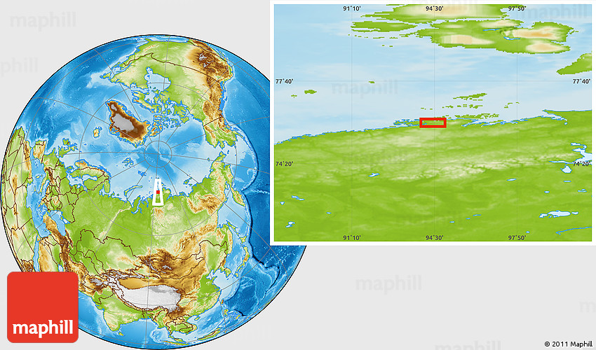 Maphill is a collection of map images. This image combines a physical map with the globe centered on the area around 75° 58' 58" N, 94° 25' 30" E. Use the buttons under the image to switch to different map types.