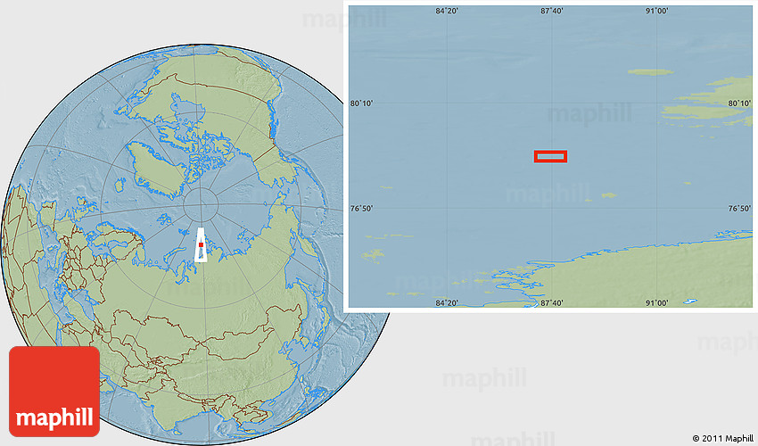 The location map of the area around 78° 27' 57" N, 87° 37' 30" E combines two projections: the orthographic azimuthal projection for the globe and the simple geographic projection for the rectangular part of the map. Geographic projection has straight meridians and parallels, each degree of latitude and longitude is the same size over the entire world map.
