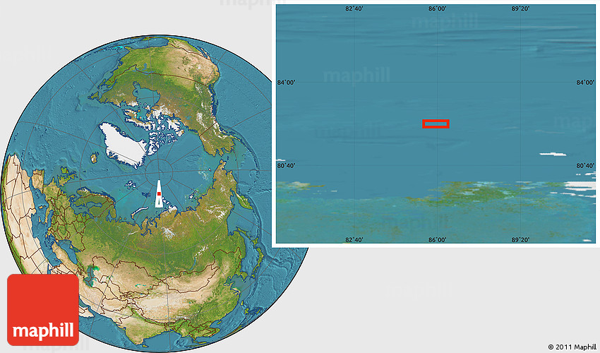 Maphill is a collection of map images. This image combines a satellite map with the globe centered on the area around 82° 19' 54" N, 85° 55' 30" E. Use the buttons under the image to switch to different map types.