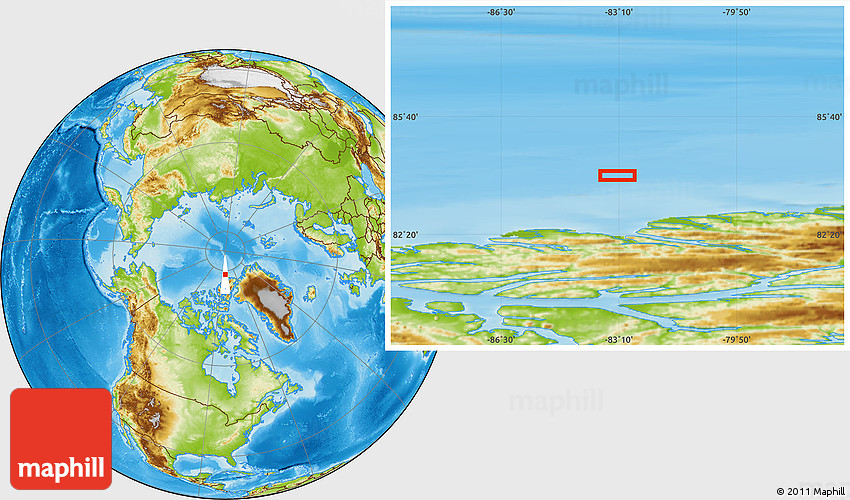 Maphill is a collection of map images. This image combines a physical map with the globe centered on the area around 84° 0' 16" N, 83° 13' 29" W. Use the buttons under the image to switch to different map types.
