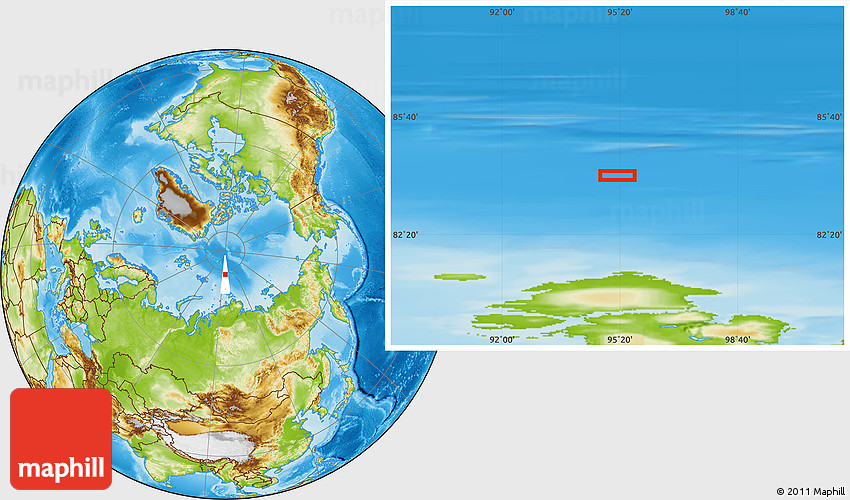 Maphill is a collection of map images. This image combines a physical map with the globe centered on the area around 84° 0' 16" N, 95° 16' 30" E. Use the buttons under the image to switch to different map types.