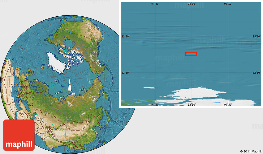 Maphill is a collection of map images. This image combines a satellite map with the globe centered on the area around 84° 12' 27" N, 94° 25' 30" E. Use the buttons under the image to switch to different map types.