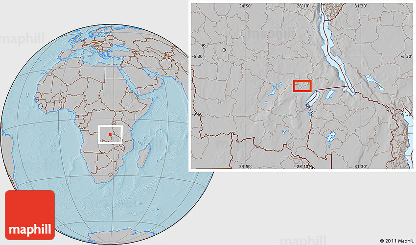 Maphill is a collection of map images. This image combines a gray map with the globe centered on the area around 8° 12' 42" S, 28° 7' 30" E. Use the buttons under the image to switch to different map types.