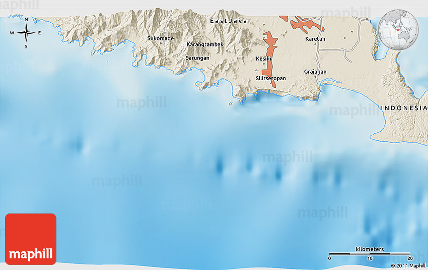 Shaded relief map shows landscape features, such as mountains, valleys and plateaus. Flat areas are smooth on the map, areas with steep slopes and mountains appear more rough. The above map of the area around 8° 44' 0" S, 113° 58' 29" E was created using a digital elevation model.