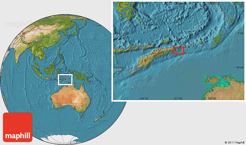 Maphill is a collection of map images. This image combines a satellite map with the globe centered on the area around 8° 44' 0" S, 127° 34' 30" E. Use the buttons under the image to switch to different map types.
