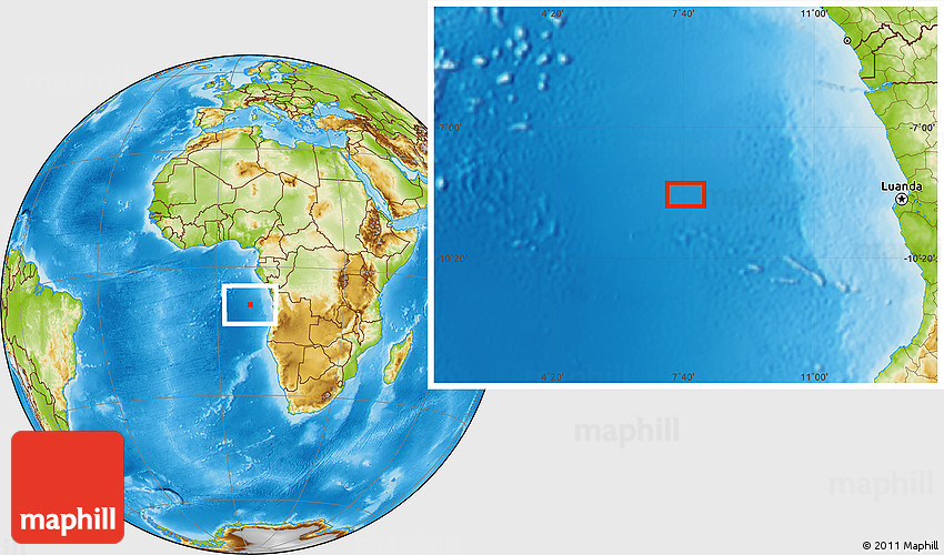 Maphill is a collection of map images. This image combines a physical map with the globe centered on the area around 8° 44' 0" S, 7° 43' 29" E. Use the buttons under the image to switch to different map types.
