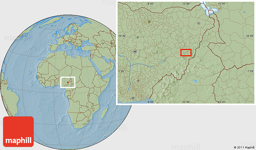 Maphill is a collection of map images. This image combines a savanna style map with the globe centered on the area around 9° 4' 52" N, 11° 58' 29" E. Use the buttons under the image to switch to different map types.