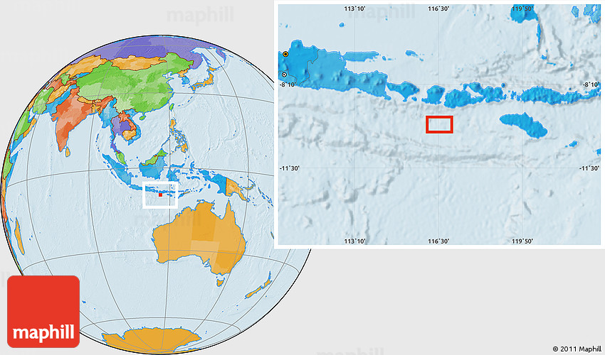 Maphill is a collection of map images. This image combines a political map with the globe centered on the area around 9° 46' 31" S, 116° 31' 30" E. Use the buttons under the image to switch to different map types.