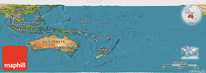 The panoramic satellite map represents one of several map types and styles available. Look at the continent of Australia and Oceania from different perspectives.
