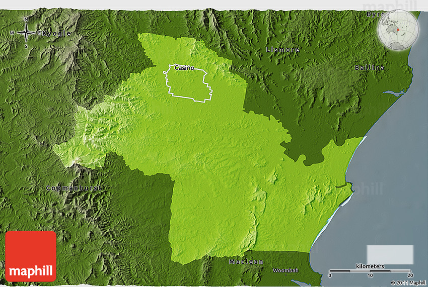 Physical map illustrates the mountains, lowlands, oceans, lakes and rivers and other physical landscape features of Richmond River. Differences in land elevations relative to the sea level are represented by color.