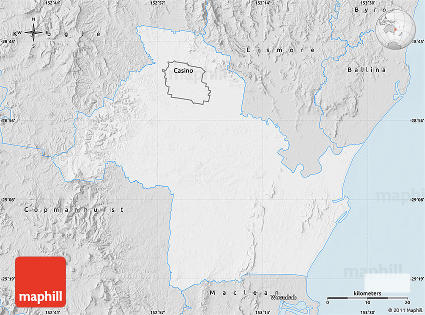 The flat silver style map represents one of several map types and styles available. Look at Richmond River, New South Wales, Australia from different perspectives.